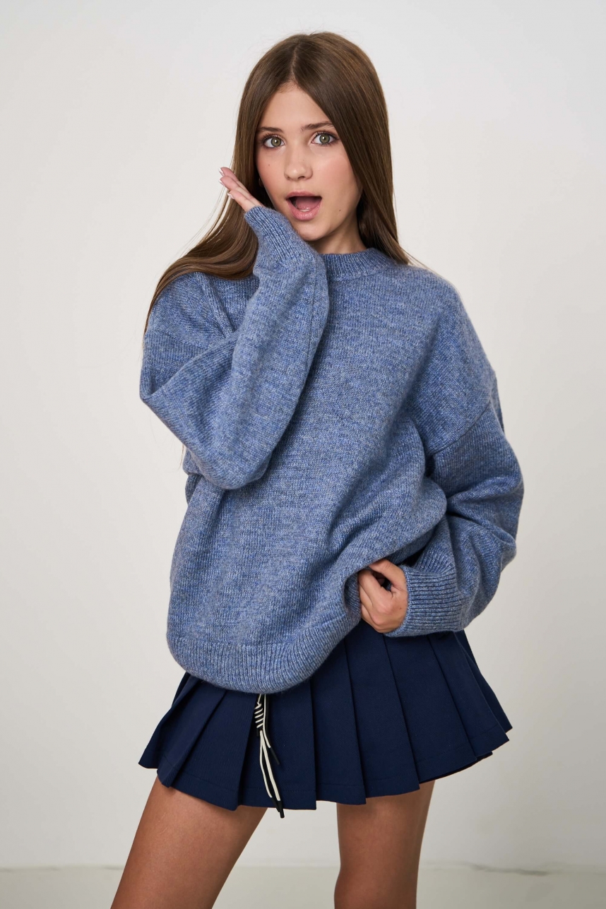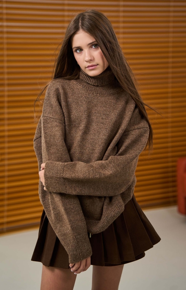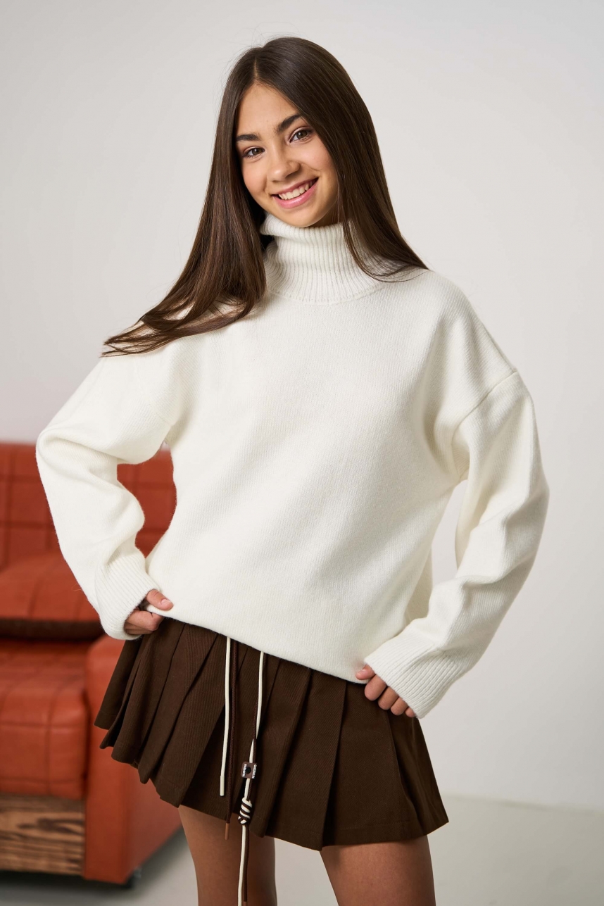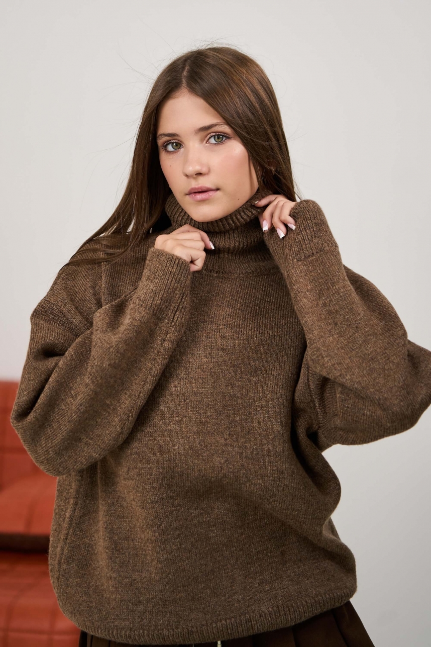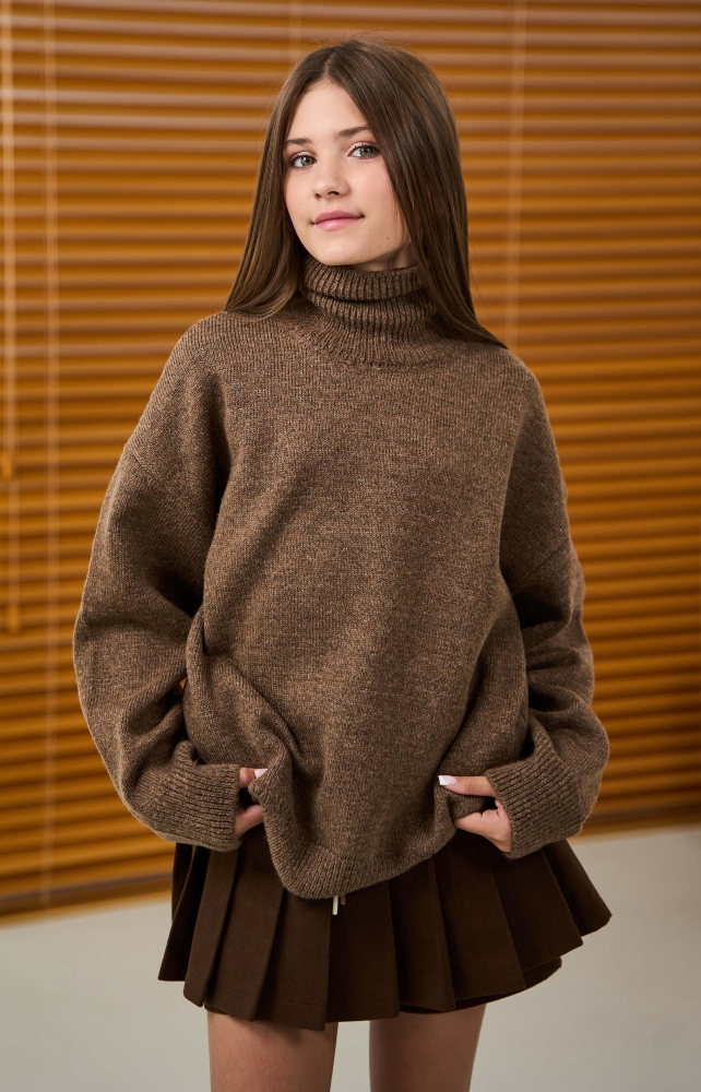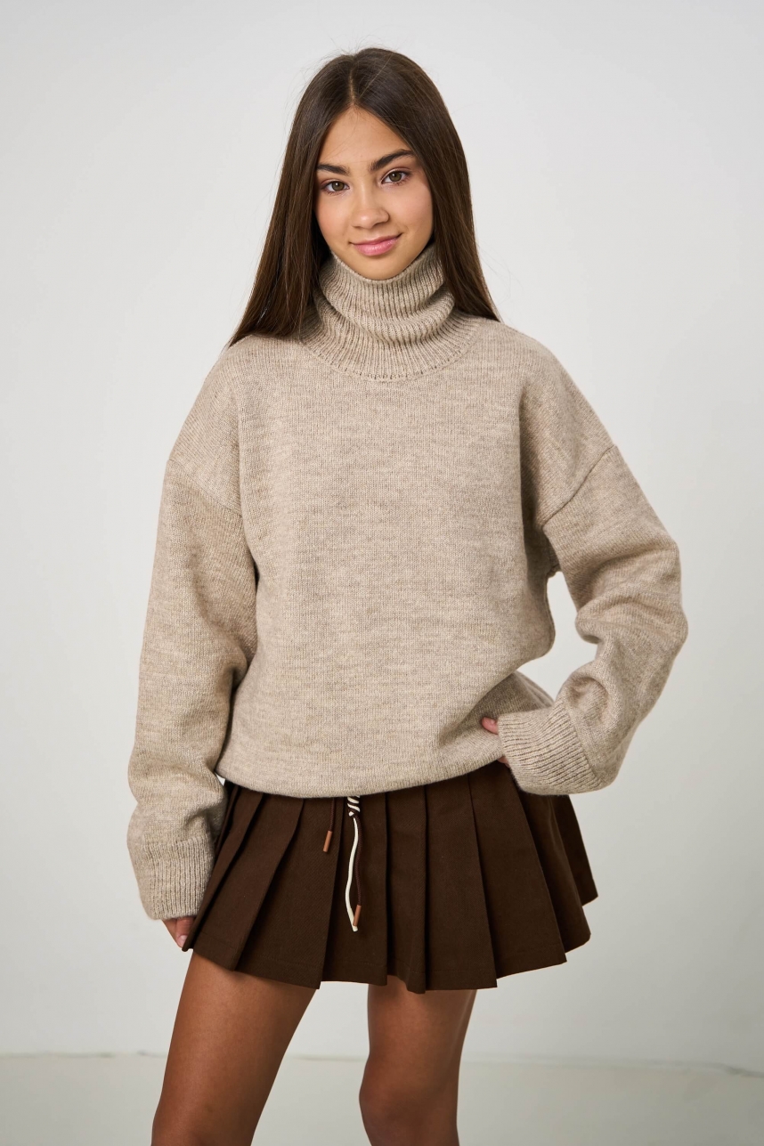 Вязаный свитер среднего объема из мягкой шерстяной пряжи (не колется!). Модель прямого кроя с високим воротником с широкими манжетами на рукавах и внизу изделия.