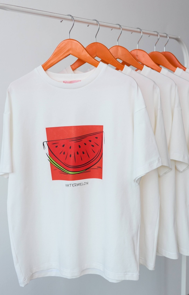 Біла трикотажна футболка вільного крою з яскравим принтом. Має спущену лінію плеча та широкий подовжений рукав. Горловина окантована рібаною в колір футболки.