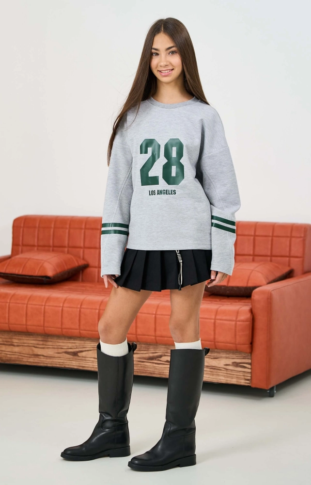 Трикотажний лонгслів вільного крою - базова база гардеробу сучасної дівчинки. Щільна двостороння тканина, вільний силует, спущена лінія плеча, контрастний напис спереду та на рукавах.