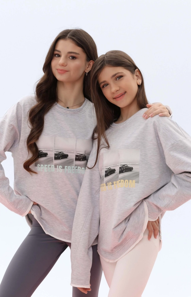 Трикотажний лонгслів вільного крою з контрастними кантами по низу та рукавах. Щільна трикотажна тканина, вільний силует, спущена лінія плеча, необроблені краї манжетів та акцентний напис.