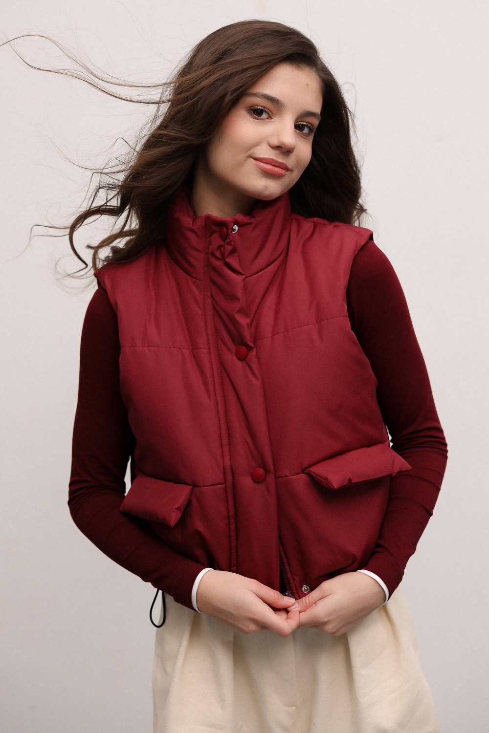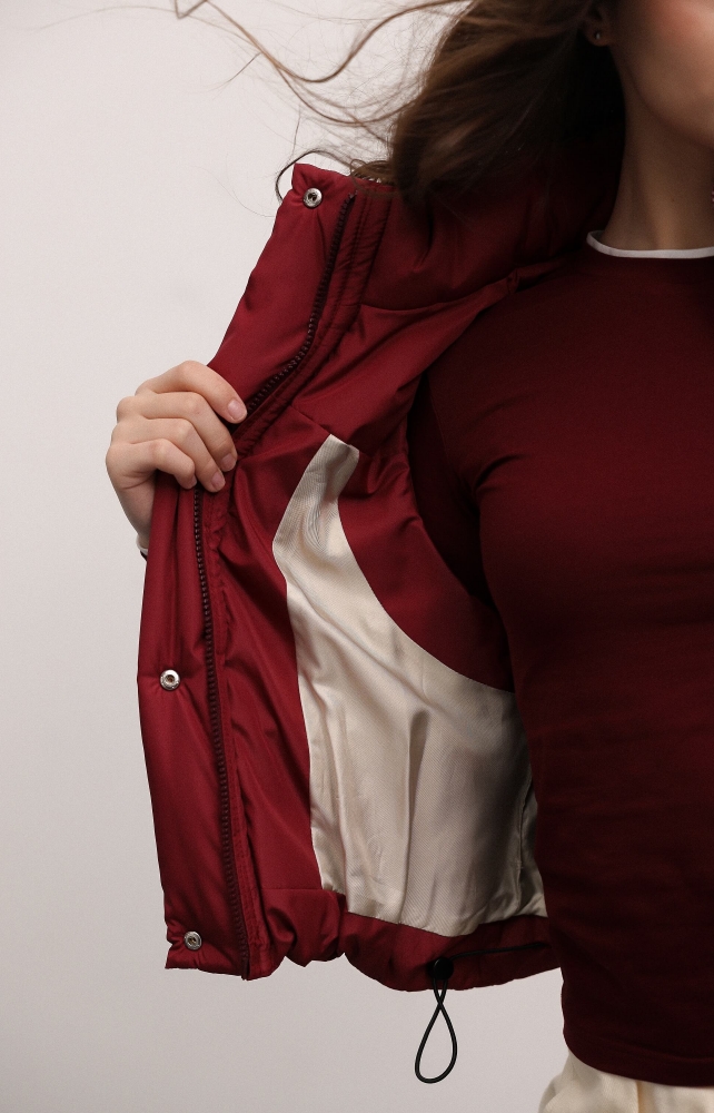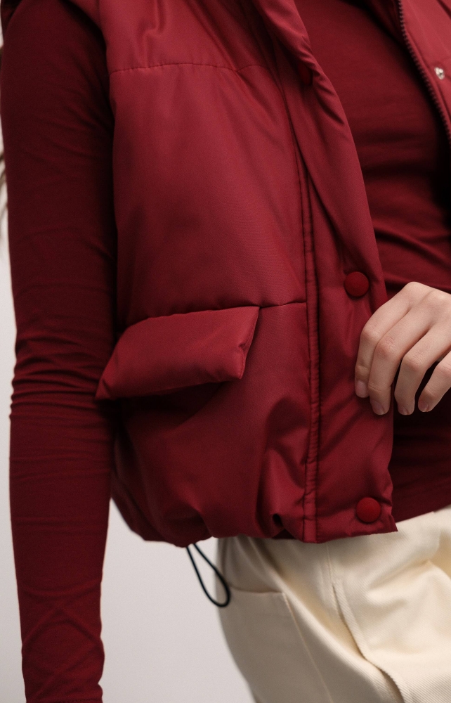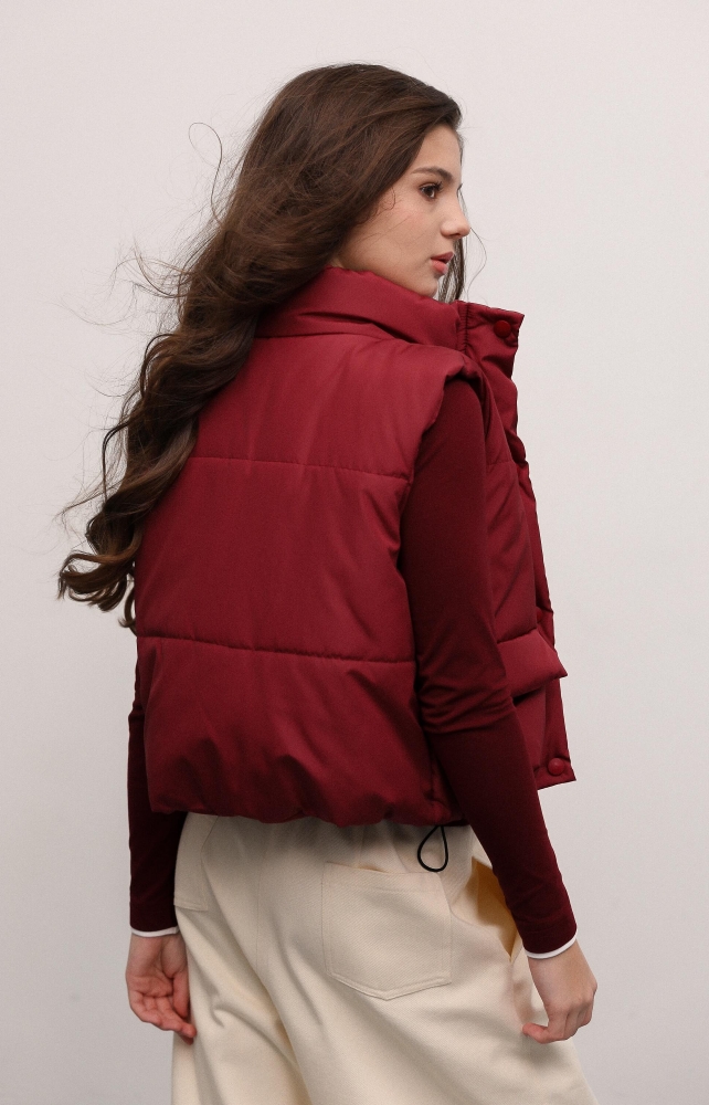 Вкорочений стьобаний жилет виконаний з водовідштовхувальної плащової тканини на утеплювачі з холософту. Модель має актуальний крій, довжина регулюється за допомогою резинки, є місткі кишені з об'ємними клапанами. Жилет застібається на приховану тракторну блискавку та кнопки.