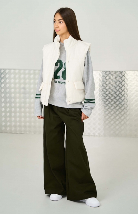 Вкорочений стьобаний жилет виконаний з водовідштовхувальної плащової тканини на утеплювачі з холософту. Модель має актуальний крій, довжина регулюється за допомогою резинки, є місткі кишені з об'ємними клапанами. Жилет застібається на приховану тракторну блискавку та кнопки.