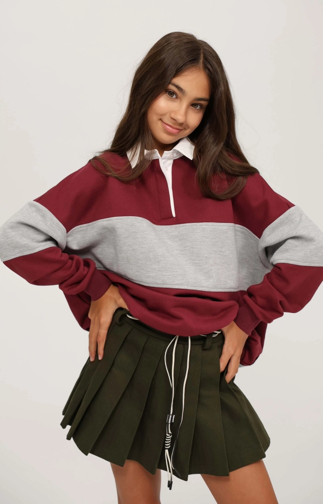 Спідниця-шорти у складку зі щільного котону, який гарно тримає форму. Підкладка у вигляді шортів виконана з такої ж тканини. Шорти та спідниця фіксуються окремими блискавками та ґудзиком, спинка пояса на широкій, цупкій резинці.
