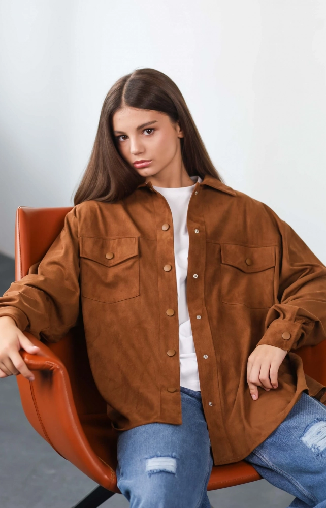 Сорочка вільного крою з двостороннього замшу преміальної якості. Тканина дуже м'яка та приємна на дотик. Сорочка має спущену лінію плеча, накладні кишені на грудях, застібки - кнопки.
