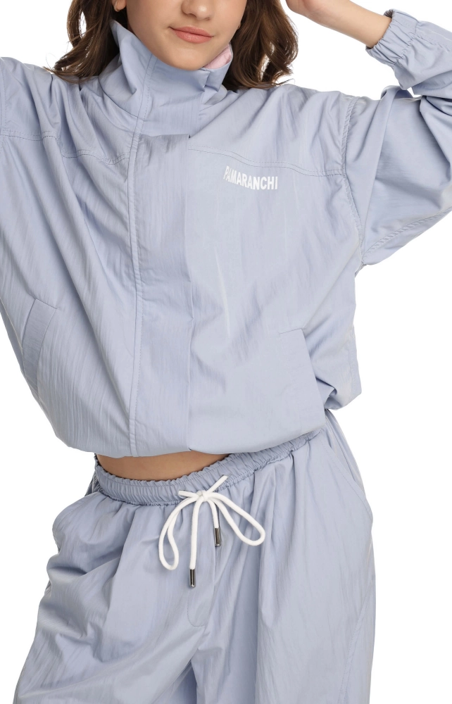 Короткий бомбер з тонкої жатої плащової тканини з контрасними деталями, що надає виробу сучасного вигляду та фактурності. Застібається на приховану блискавку та кнопки-магніти на планці. З боків місткі кишені та велика накладна кишеня на спинці. На рукавах еластичні манжети. По низу бомбера - куліска для регулювання об'єму виробу.