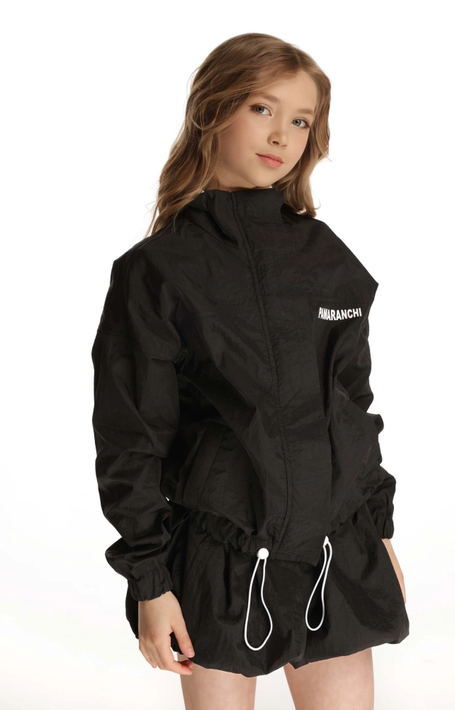 Короткий бомбер з тонкої жатої плащової тканини з контрасними деталями, що надає виробу сучасного вигляду та фактурності. Застібається на приховану блискавку та кнопки-магніти на планці. З боків місткі кишені та велика накладна кишеня на спинці. На рукавах еластичні манжети. По низу бомбера - куліска для регулювання об'єму виробу.