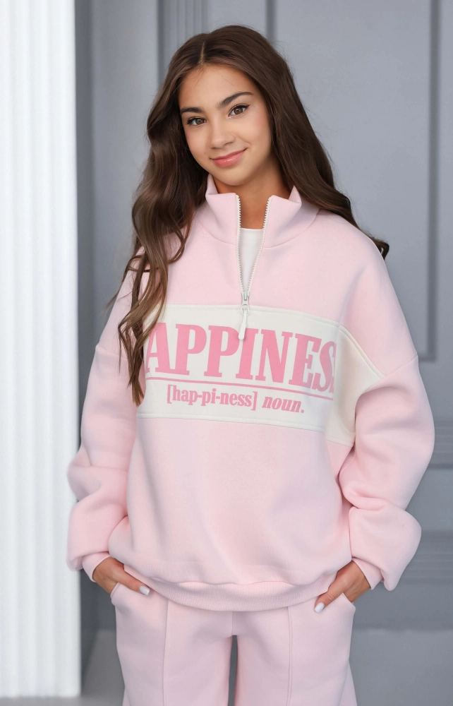Трикотажний подовжений світшот вільного силуету. Утеплений. Модель має спущену лінію плеча, констрастні блискавку та напис з флоку, по низу світшота і рукавів широка резинка з еластичної рібани в рубчик.