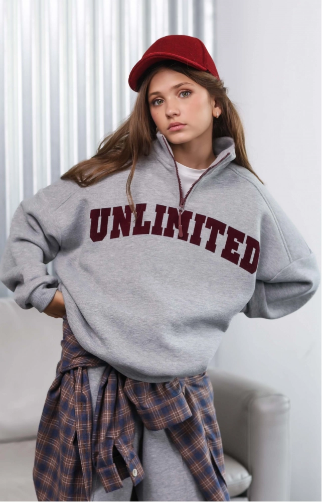 Трикотажний подовжений світшот вільного силуету. Утеплений. Модель має спущену лінію плеча, констрастні блискавку та напис, по низу світшота і рукавів широка резинка з еластичної рібани в рубчик.