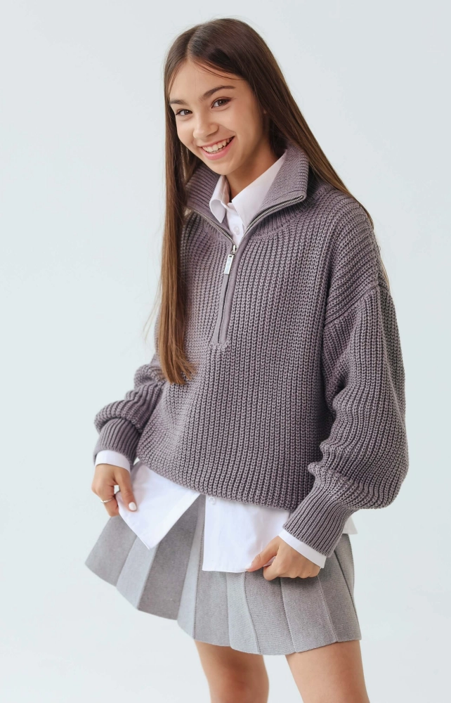 В'язаний светр прямого крою  з широким коміром-стійкою на блискавці. Модель середньої довжини, в'язка в рубчик. Виготовлений з бавовняної пряжі, гарно тримає форму та  не колеться(!)