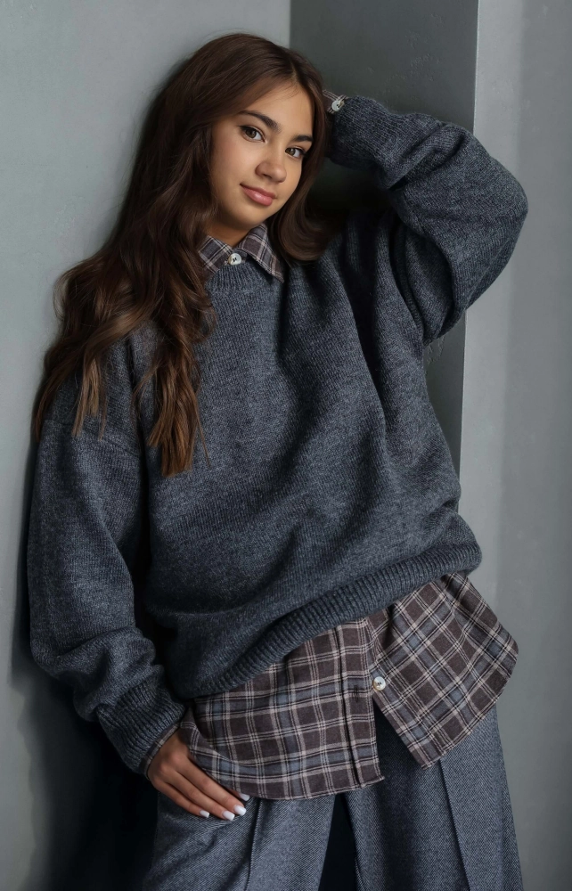 В'язаний светр середнього об'єму з м'якої вовняної пряжі (не колеться!). Модель прямого крою з круглою горловиною з широкими манжетами на рукавах та по низу виробу.